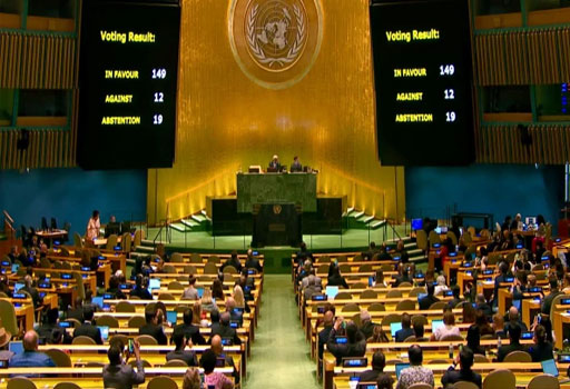 193 ارکان پر مشتمل جنرل اسمبلی میں پیش کی گئی اس قرارداد کے حق میں پاکستان سمیت 149 ممالک نے ووٹ دیا، جبکہ 19 ممالک نے ووٹنگ میں حصہ نہیں لیا۔ امریکہ، اسرائیل اور دیگر 10 ممالک نے اس قرارداد کے خلاف ووٹ ڈالے۔