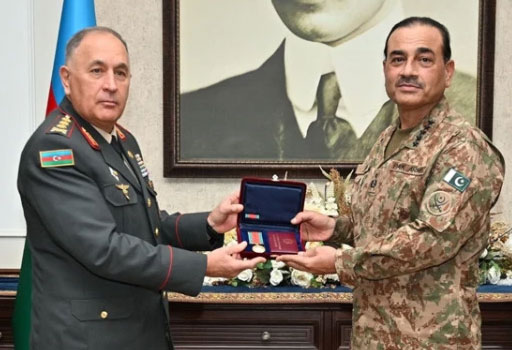 راولپنڈی ۔آذربائجان کے فرسٹ ڈپٹی وزیر دفاع اور چیف آف جنرل اسٹاف کرنل جنرل کریم والیئف نے جی ایچ کیو راولپنڈی میں فیلڈ مارشل سید عاصم منیر سے ملاقات کی اور پاک فوج کے سربراہ کو آذربائیجان کا اعلیٰ ترین “پیٹریاٹک وار میڈل” عطا کیا۔