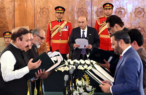 اسلام آباد ۔ایوانِ صدر میں منعقدہ حلف برداری کی تقریب میں صدرِ مملکت آصف علی زرداری نے نئے وزرا سے حلف لیا۔تقریب میں وزیرِاعظم شہباز شریف اور دیگر وفاقی وزرا بھی شریک تھے۔